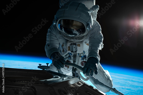 Wall mural : Female astronaut performing spacewalk, working on a outer part of a space craft