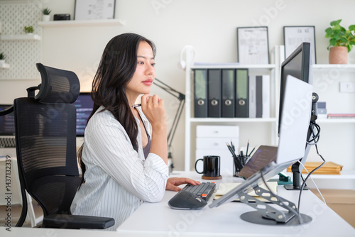The watermark will not be included on Wall mural.: Female coder reviewing code, working remotely with organized desktop and ergonomic gear -