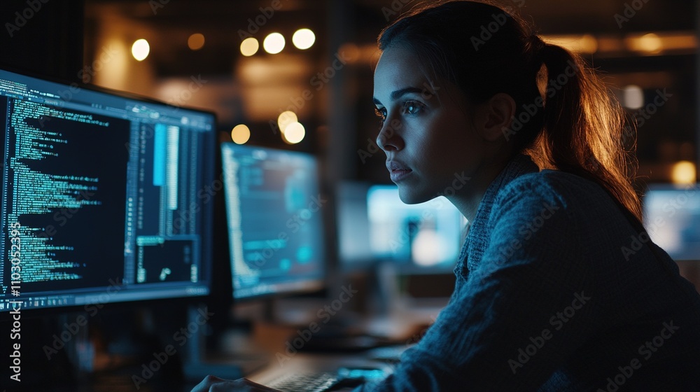 The watermark will not be included on Wall mural.: Female coder working late on computer with coding screen display