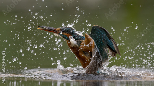Wall mural : Female common kingfisher emerging from a dive with a green background