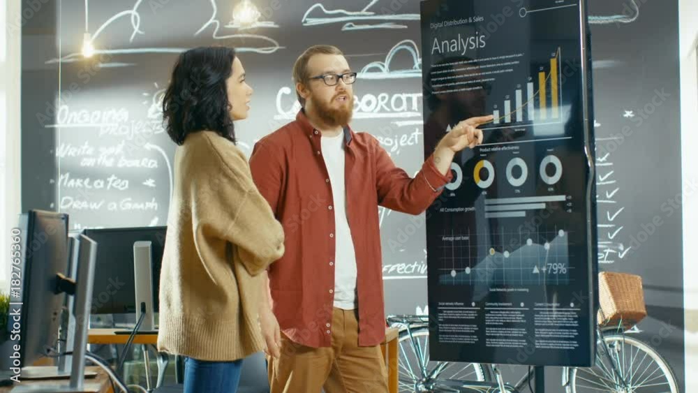 The watermark will not be included on Wall mural.: Female developer and male statistician use interactive whiteboard presentation touchcreen to look at