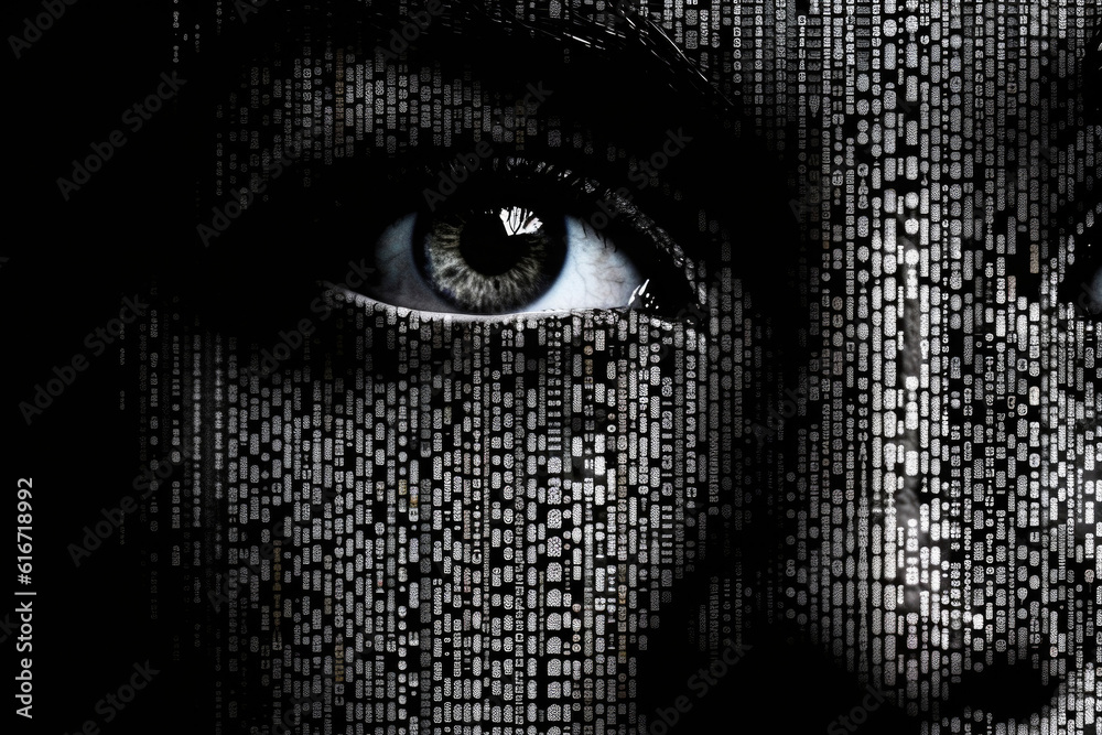 Female face against binary code - human looking at camera from matrix digital signs and numbers - artiWall mural