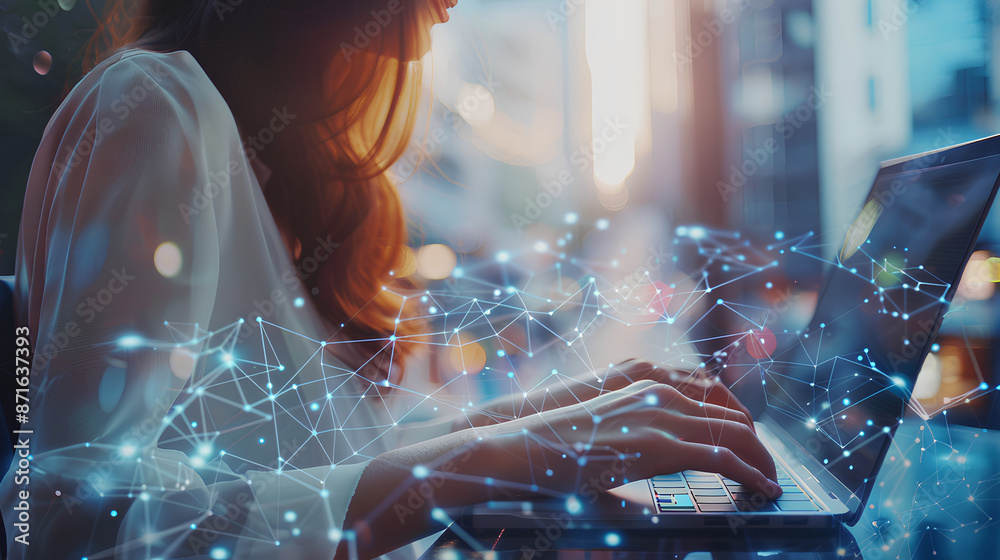 The watermark will not be included on Wall mural.: Female hands with laptop - young woman working remotely at home - concept of networking or remote work