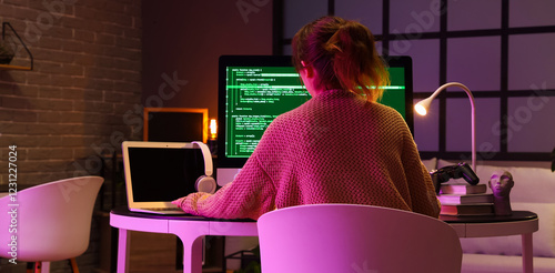 The watermark will not be included on Wall mural.: Female programmer working at table in office, back view