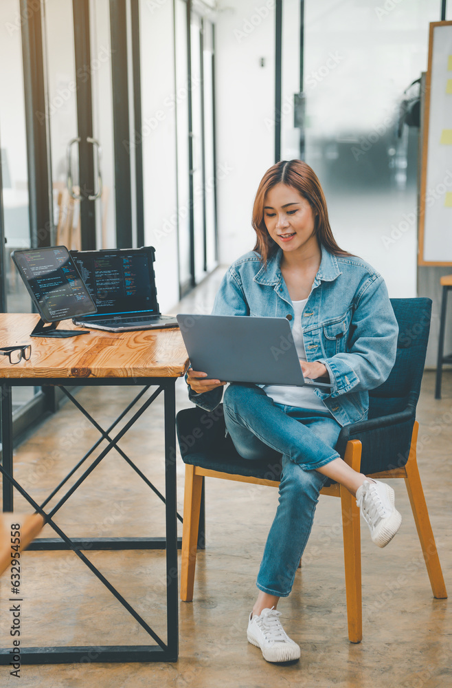 The watermark will not be included on Wall mural.: Female programmer working on coding, software development and web design - concept technology developm