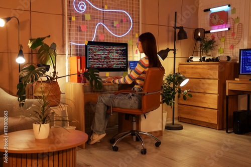 The watermark will not be included on Wall mural.: Female programmer working with computer in office at night