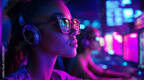 The watermark will not be included on Wall mural.: Female programmers immersed in their work, coding and designing software well beyond regular hours i