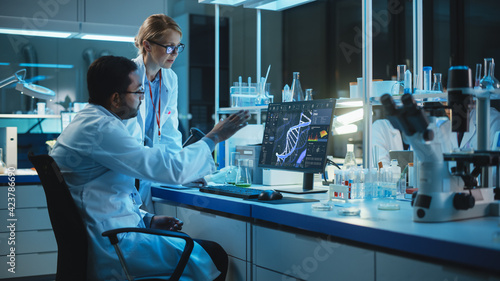 The watermark will not be included on Wall mural.: Female research scientist with bioengineer working on a personal computer with screen showing dna an