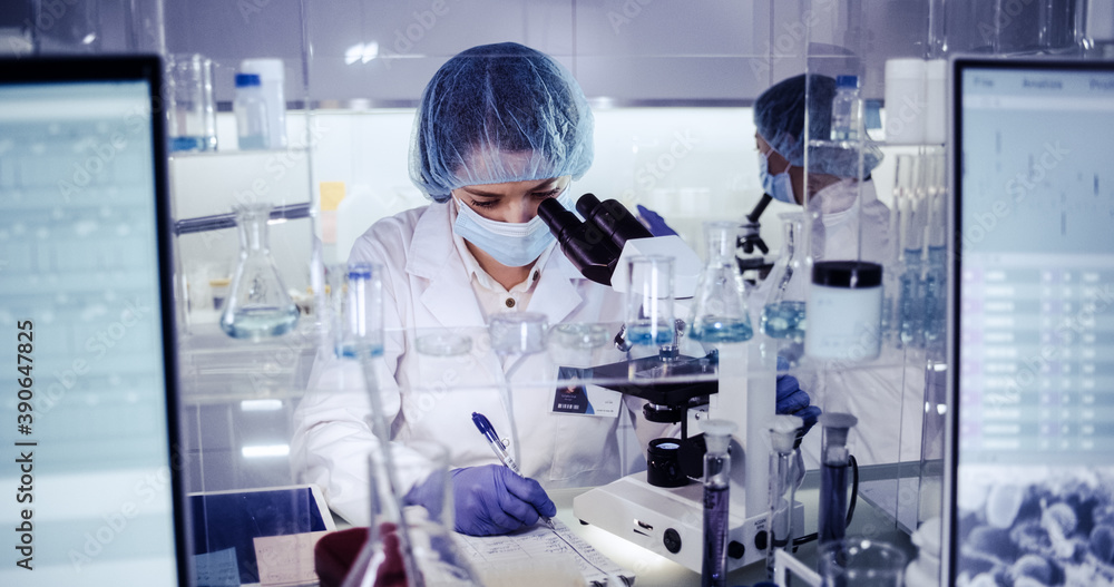 The watermark will not be included on Wall mural.: Female science team working on biohazardous samples - using microscope and computer with data