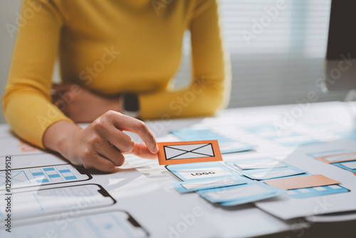 The watermark will not be included on Wall mural.: Female ux designer is working on a mobile application wireframe prototype, organizing sticky notes w