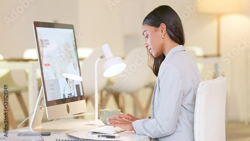 Wall mural female web designer typing on a computer and comparing graphic notes to a screen. website creative p
