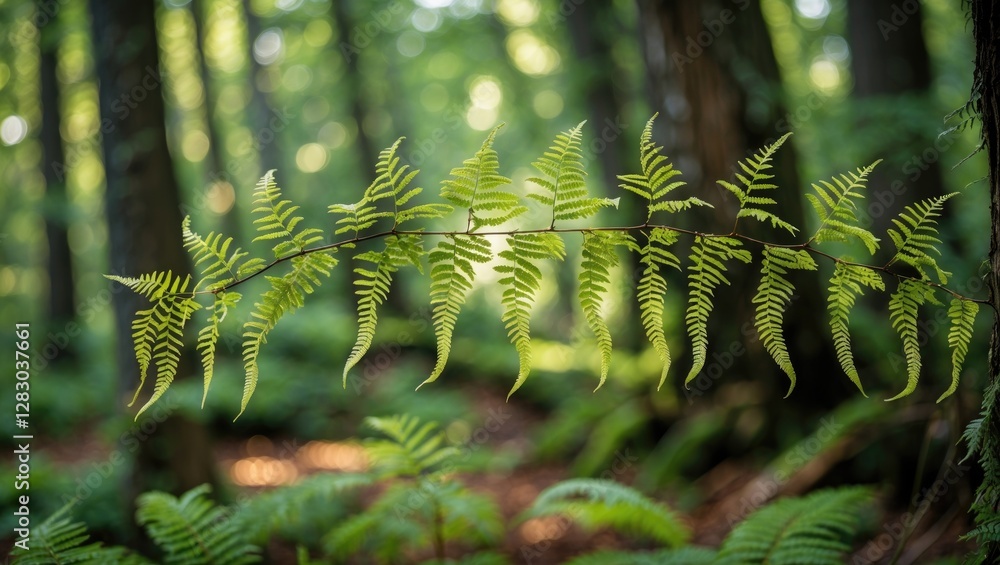 Fern leaf with sunlight filtering through a forest background in a natural settingWall mural