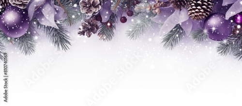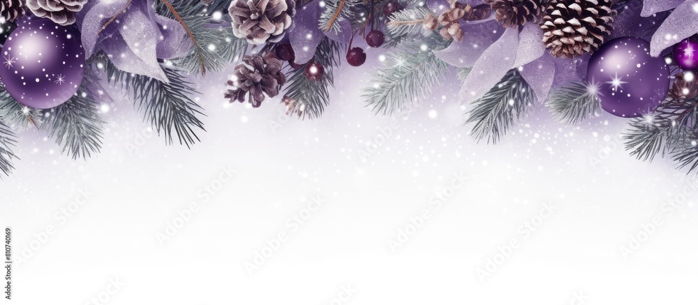 Festive header with a snowy frame of purple christmas decorations and pine twigs creating a holiday Wall mural