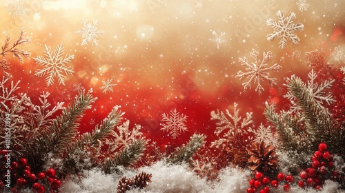 Wall mural festive winter background with sparkling snowflakes pine branches berries and soft bokeh lights crea