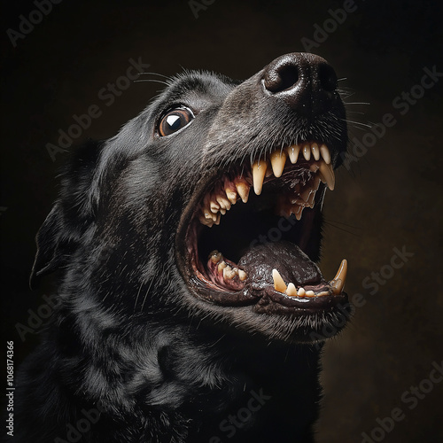 Fierce black dog baring its teeth in an intimidating display, captured with a sharp focus on its intWall mural