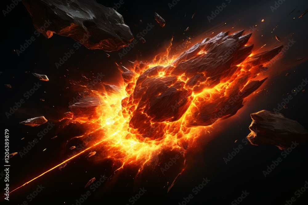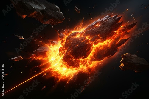 Wall mural : Fiery asteroid exploding in space, creating debris and molten lava, cosmic event of destruction