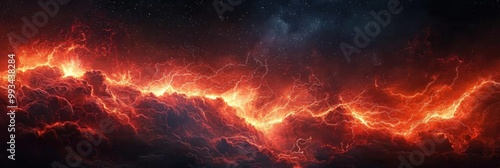 Wall mural : Fiery red and orange cosmic storm with lightning bolts illuminating turbulent clouds and dark starry