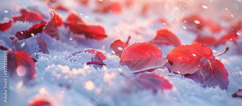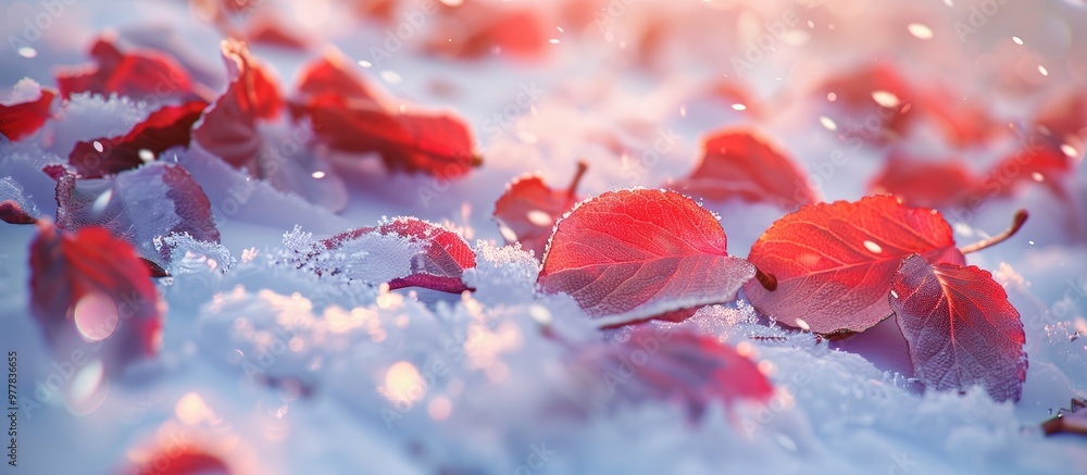 The watermark will not be included on Wall mural.: Final red leaves blanketed by snow in winter - copy space image - place for adding text and design