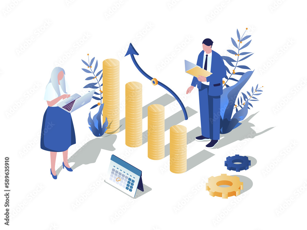 Wall mural financial analytics concept 3d isometric web scene. people working with data graphs and calculating