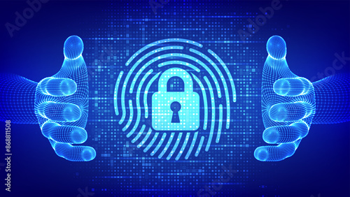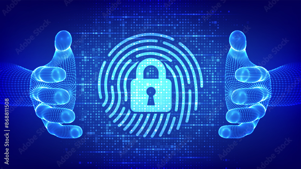 Wall mural fingerprint with padlock icon made with binary code in wireframe hands. personal data protection. cy