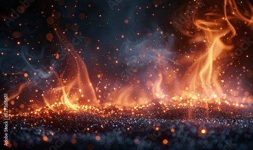 The watermark will not be included on Wall mural.: Fire embers and particles glow over a black background, creating an abstract and dynamic effect -