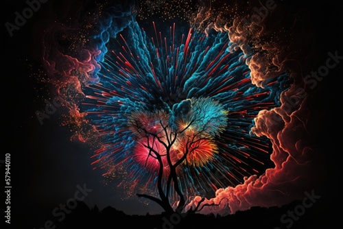 Wall mural fireworks explode in a blue and multicolored sky against a black backdrop. generative ai