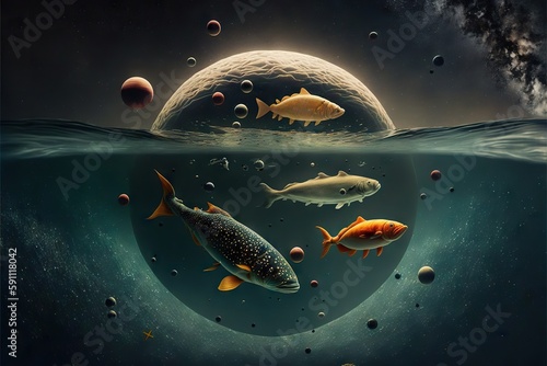 The watermark will not be included on Wall mural.: Fishes floating in outer space with planets, created with generative ai