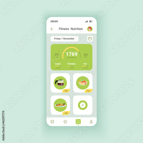 Wall mural fitness nutrition dark smartphone interface vector template. mobile app page design layout. healthy
