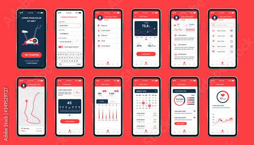 Wall mural : Fitness workout unique design kit for mobile app - fitness tracker screens with running route planner