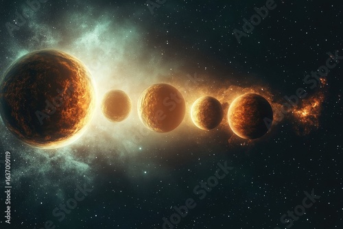 The watermark will not be included on Wall mural.: Five planets aligned in space glow with warm light, surrounded by nebulous clouds and distant stars