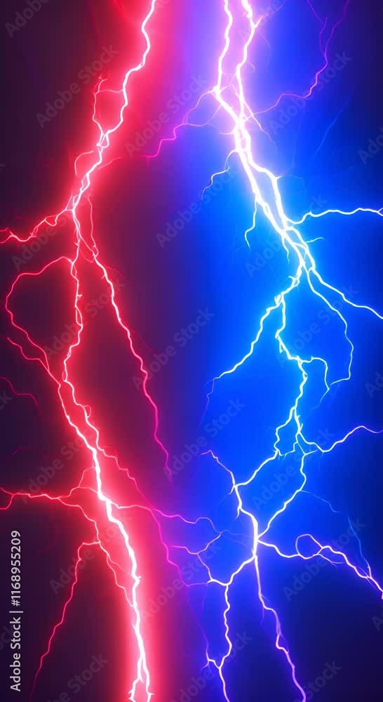 Wall mural : Flashing collision red and blue background versus footage seamless loop powerful colored lightnings