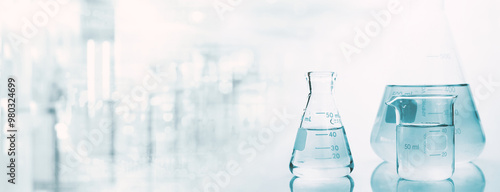 Wall mural : Flask and beaker with water in research science lab white banner background