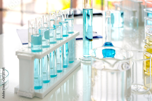 Wall mural flask in scientist hand with test tubes in laboratory - Wall murals Wall mural flask in scientist hand with test tubes in laboratory - Wall murals