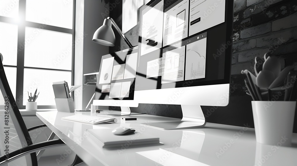 Wall mural flat black and white web design studio page layout on modern computer display with flying page layou - Wall murals Wall mural flat black and white web design studio page layout on modern computer display with flying page layou - Wall murals