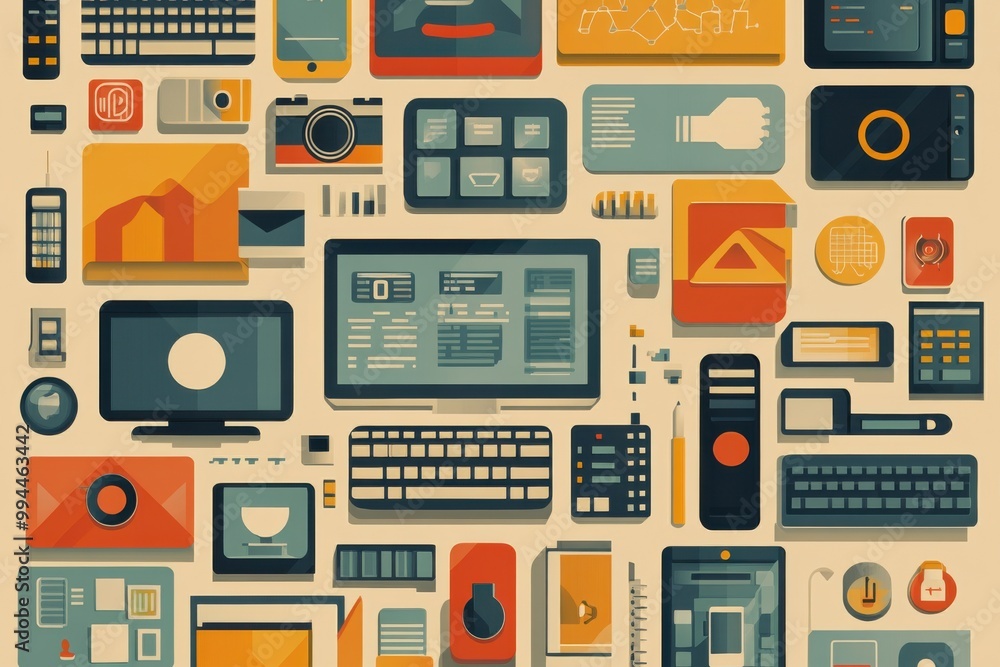 Wall mural flat illustration depicting a diverse array of digital gadgets and technology items, showcasing mode - Wall murals Wall mural flat illustration depicting a diverse array of digital gadgets and technology items, showcasing mode - Wall murals