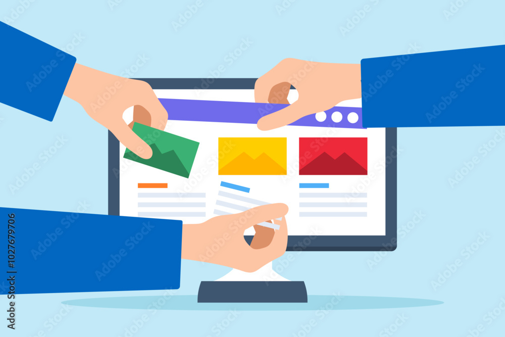 Wall mural flat illustration of hands help build website on computer screen with template customization and seo - Wall murals Wall mural flat illustration of hands help build website on computer screen with template customization and seo - Wall murals