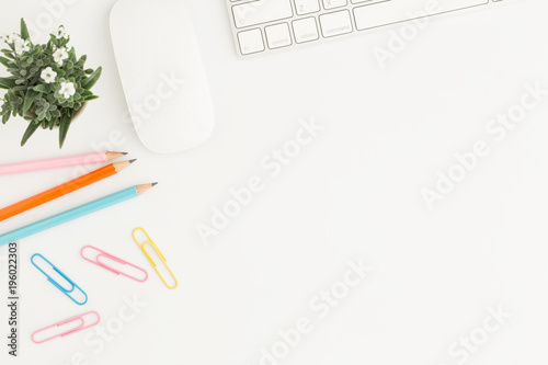 Wall mural : Flat lay photo of office desk with mouse and keyboard white copy space with pencil top view