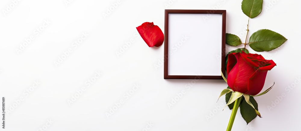 Wall mural flat lay view of a red rose and photo frame on a white background offering ample copy space for cust