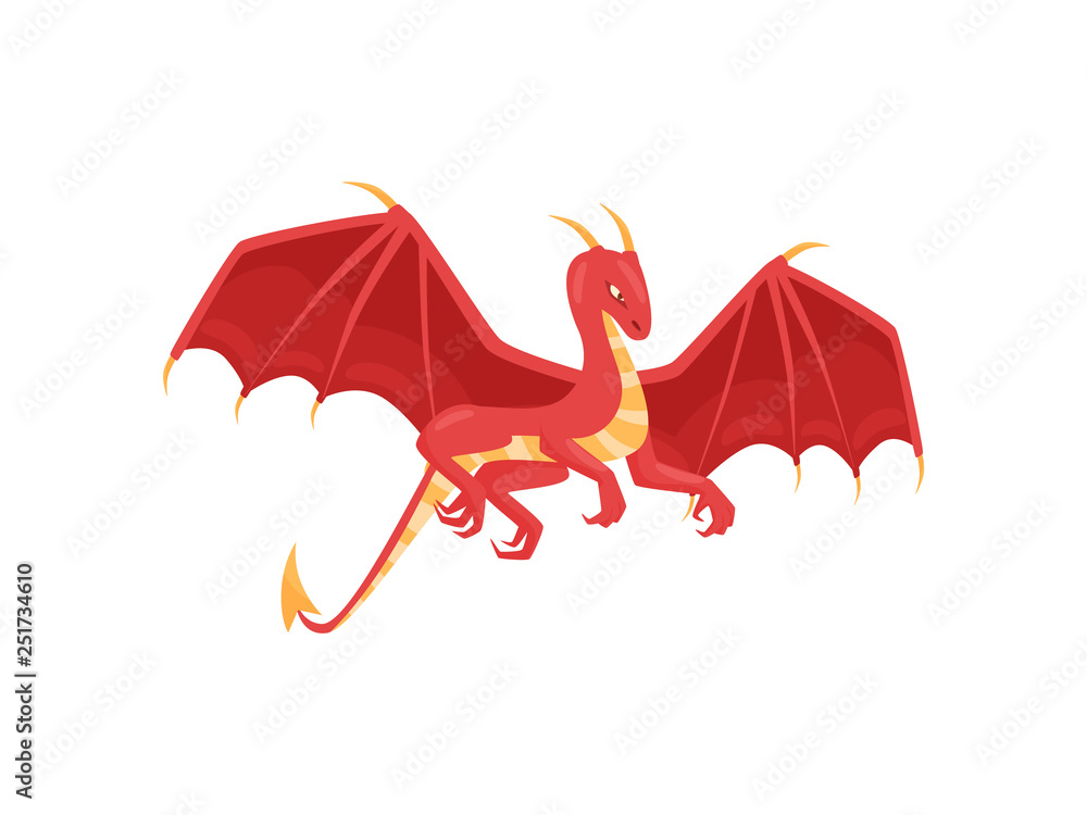 The watermark will not be included on Wall mural.: Flat vector design of red dragon with wide open wings - mythical creature with horns and long tail