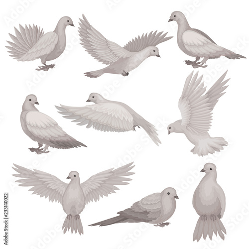 The watermark will not be included on Wall mural.: Flat vector set of dove - bird with small head, short legs and gray feathers - flying creature - wildli
