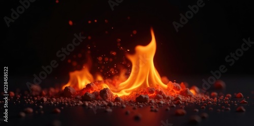 The watermark will not be included on Wall mural.: Flickering flame with glowing ember sparks on black background in warm lighting, ember, warmth