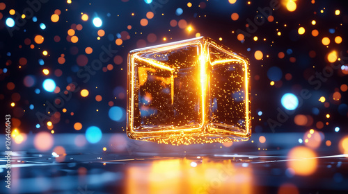 Wall mural floating light cube with particles on dark background. blockchain concept