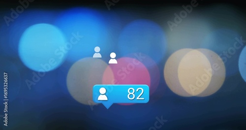 Wall mural : Floating three white user icons around bright blue notification bubble on screen, bokeh background
