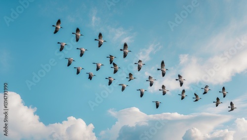 Wall mural flock of birds flying in a v shape formation across a stunning sky. abstract travel and emigration t - Wall murals Wall mural flock of birds flying in a v shape formation across a stunning sky. abstract travel and emigration t - Wall murals