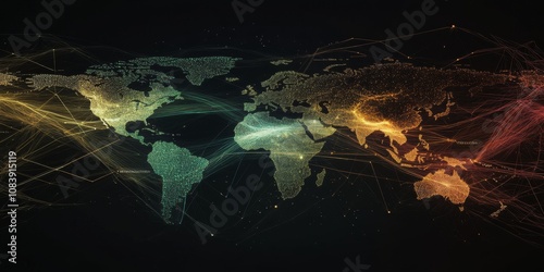 Wall mural : Flowing data lines across continents in a high-contrast color scheme,space for text
