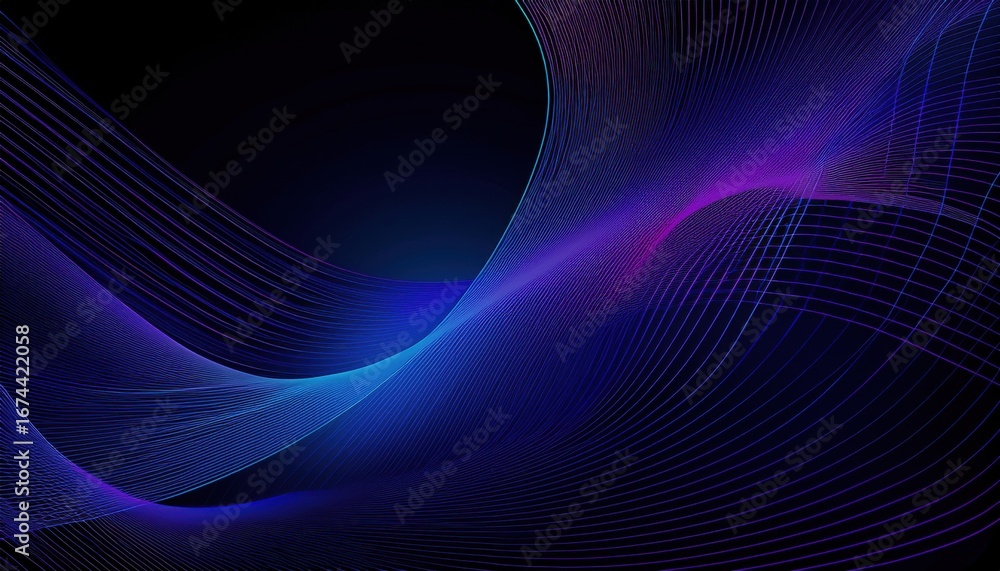 Wall mural flowing neon wave lines in deep blue and violet abstract digital background with futuristic grid tex