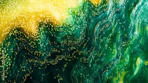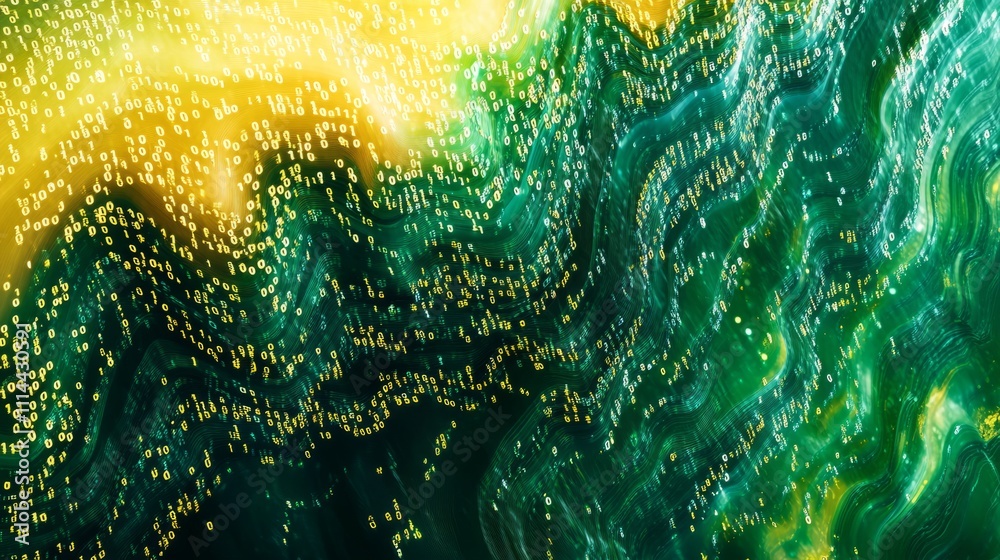 The watermark will not be included on Wall mural.: Flowing stream of binary code in green and yellow hues, representing data transfer and technology