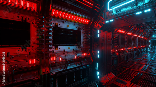 Wall mural flying into spaceship tunnel, sci-fi spaceship corridor. futuristic technology for technical titles