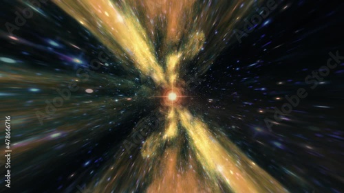 Wall mural flying star fields, many particles through hyper space warp orange green blue tunnel with center fla