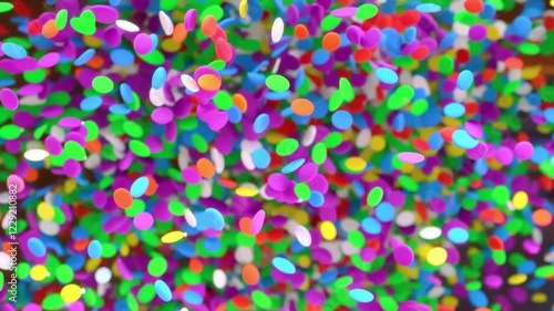 Wall mural : Focus on a dramatic slow-motion sequence of the double burst of colorful confetti particles, zooming